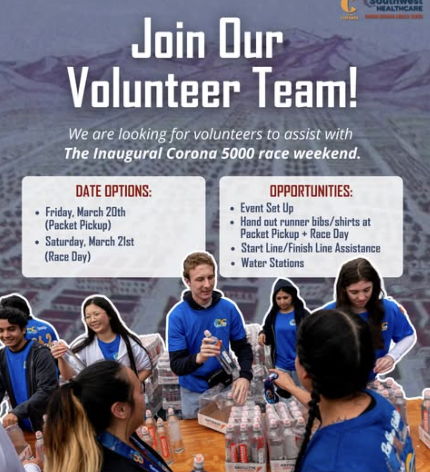 Be part of making the very first Corona 5000 a huge success! We’re seeking enthusiastic volunteers to help with a variety of important race-day duties, including: